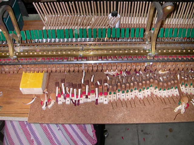 Work on the action was extensive and comprehensive, including new leather, new Steinway flanges, all new felt and cloth parts, Renner hammer shanks in two sizes (smaller diameter in the high treble) and made-to-measure Abel hammers.