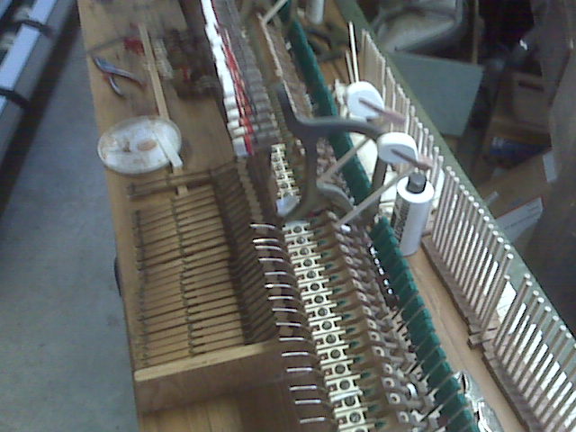 The newly strung piano, back on its feet and the keybed attached.