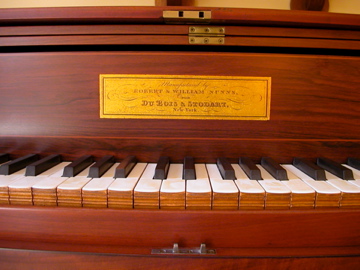 The Nunns family emigrated from London, England in 1821 and established a piano factory at 96 Broadway in New York City. Soon the firm was a principal builder of pianos in the city, later becoming known as Nunns and Clark. It was here that the young William Steinway received his introduction to American piano building and who in 1853 became one of the founders of the Steinway Piano Company. In fact, the Steinway family bought the workshops of Nunns and Clark, thus this piano was built in the same location as the early Steinways of NYC. This piano has no metal framing since this feature was only added in squares built after 1840 which allowed for greater stability and increased string tension.